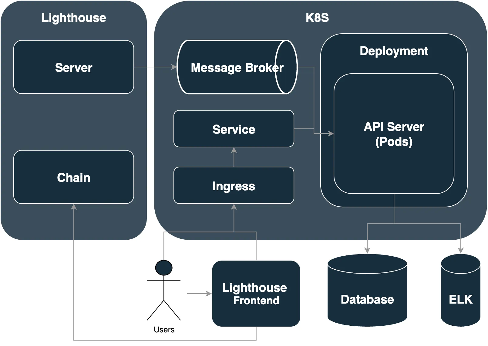 Lighthouse achieves robustness, stability, and performance by leveraging core components of Kubernetes (Ingress, Service, Deployment), a log monitoring system (ELK), and a message broker: