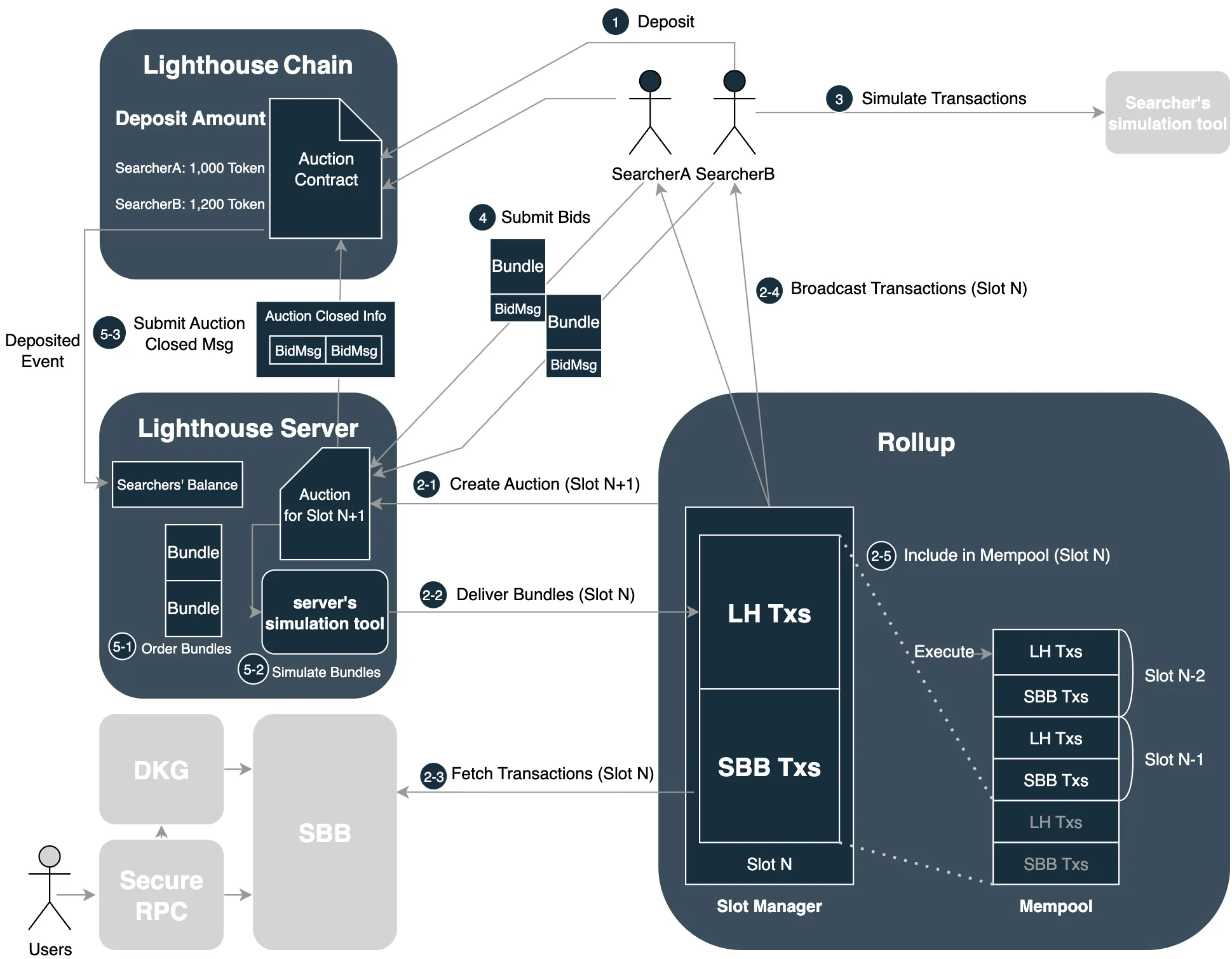 * **2-1. Create Auction (Slot N+1):** The rollup requests an auction for the next slot; Lighthouse notifies all searchers participating in the rollup’s auction.